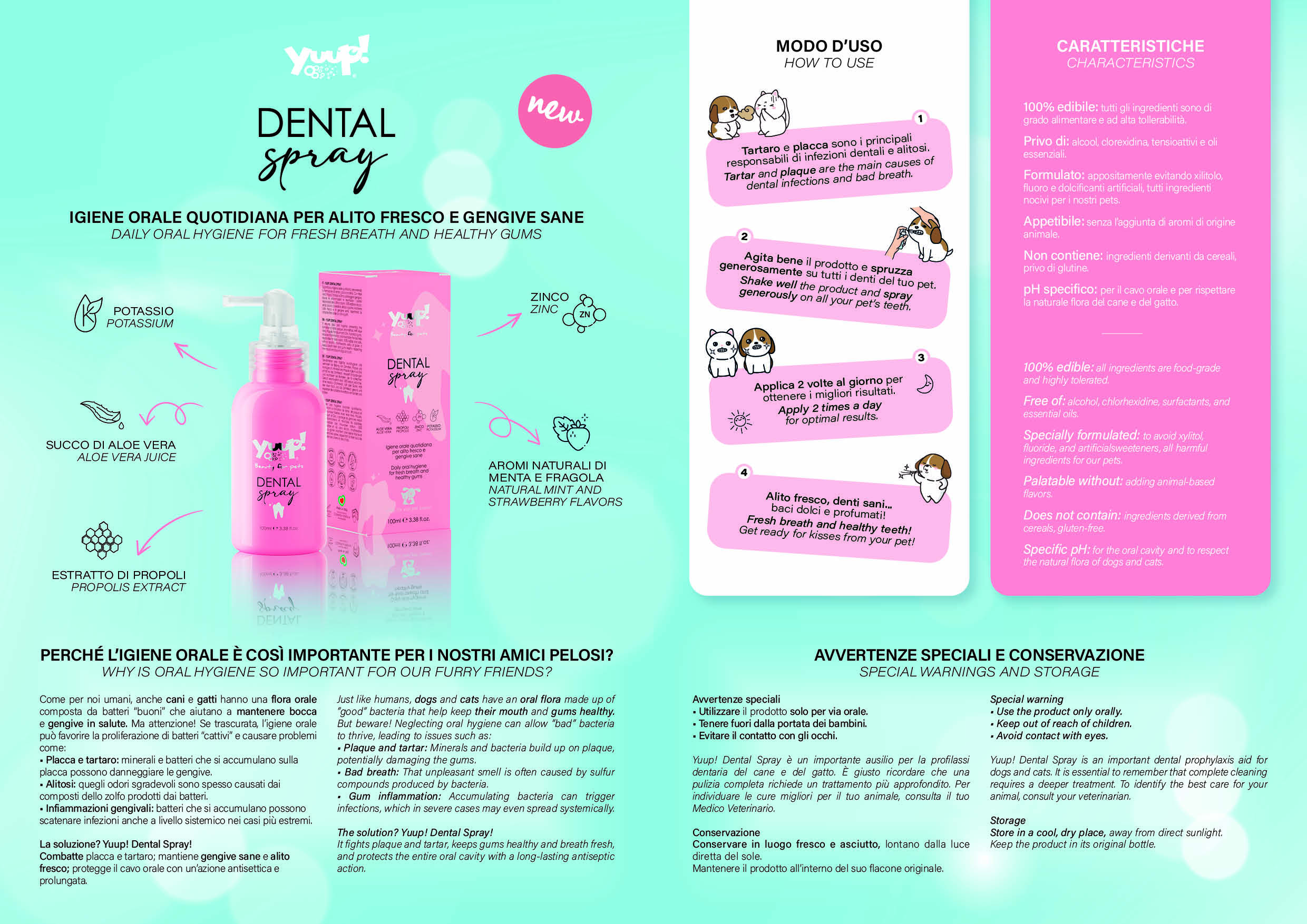 Das Yuup!® Dental Spray ist vollständig essbar und speziell auf die Bedürfnisse von Haustieren abgestimmt. Die Rezeptur ist frei von Alkohol, Chlorhexidin, Xylitol, Fluor und künstlichen Süßstoffen. Zudem enthält das Spray kein Gluten, kein Getreide und keine ätherischen Öle. Der angepasste pH-Wert unterstützt die natürliche Mundflora von Hunden und Katzen und macht das Produkt besonders schonend – auch bei regelmäßiger Anwendung.